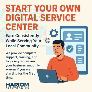 Hariom Electronics offers a powerful opportunity for individuals who want to start their own digital service center. With increasing demand for government and online services, this business model allows you to earn consistently while serving your local community.